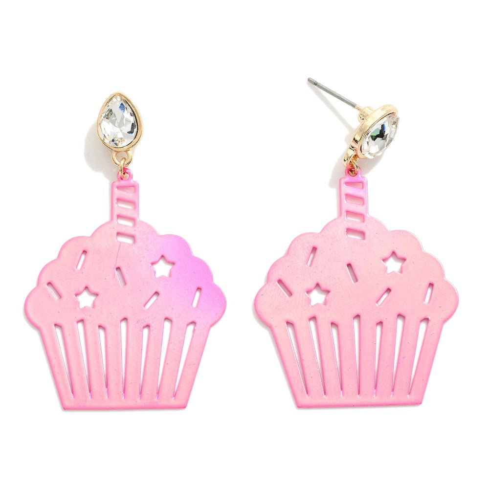 Birthday Cupcake Drop Earring With Rhinestone Candle Detail - Pink