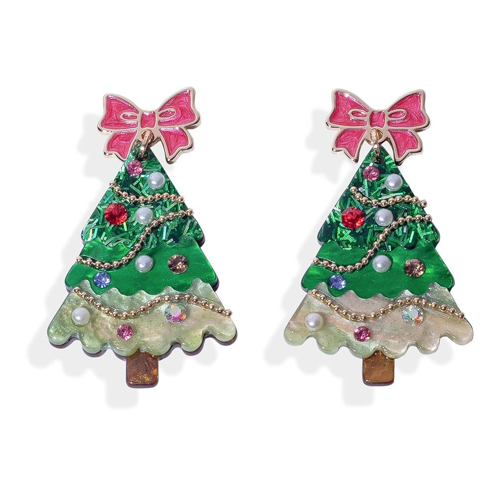 Glitter Acetate Decorated Christmas Tree Post Drop Earrings Featuring Bow Post - Green
