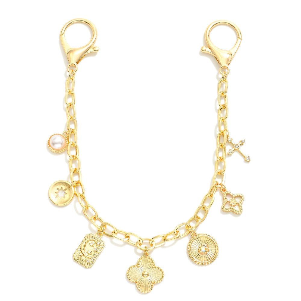 This gold-tone bag chain, measuring approximately 10 inches in length, is adorned with rhinestones, pearls, and metal-tone charms, combining elegance with distinctive detail.