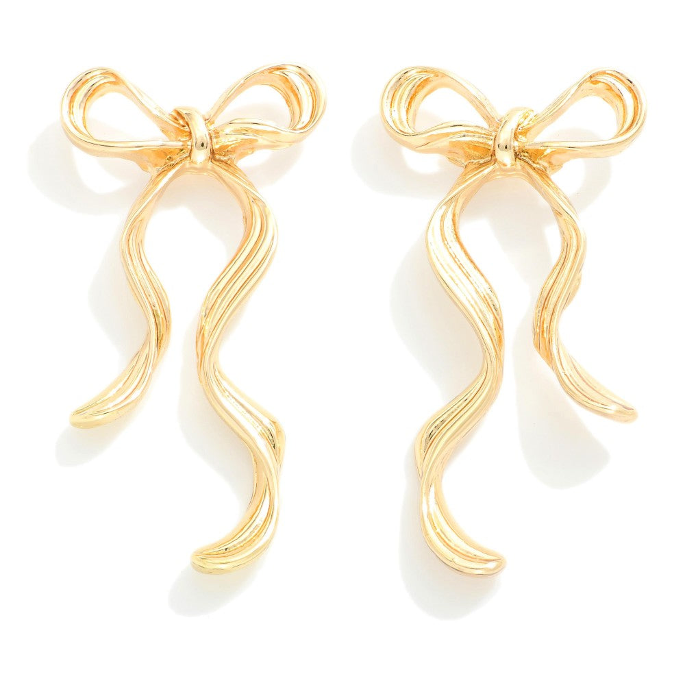 Crafted from shimmering gold metal, these post drop earrings feature a unique wavy bow design and measure approximately 1.5 inches in length. Perfect for adding a touch of elegance to any outfit.