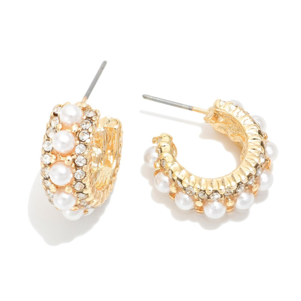 These hoop earrings, adorned with pearls and rhinestones, measure approximately 0.5 inches in diameter.
