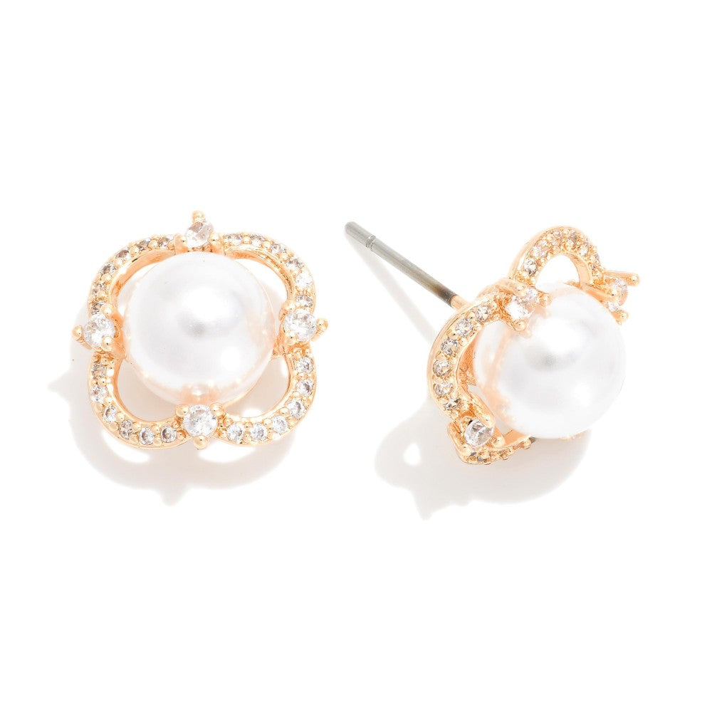 Pearl Stud Earrings Featuring Rhinestone Studded Clover Border