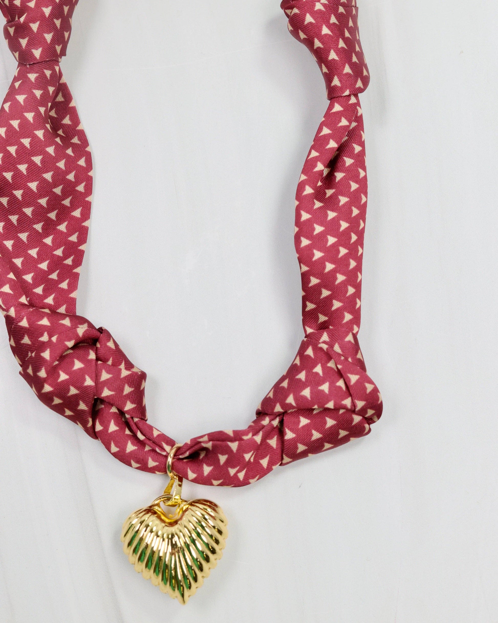Elevate your look with the Serafina Scarf Charm Necklace featuring a striking Garnet print. This satin-feel scarf is accented by a ribbed puff heart charm pendant, adding a playful yet chic touch. Designed with two stylish knots and a tie-back closure, it offers adjustable comfort and a perfect fit for any outfit.
