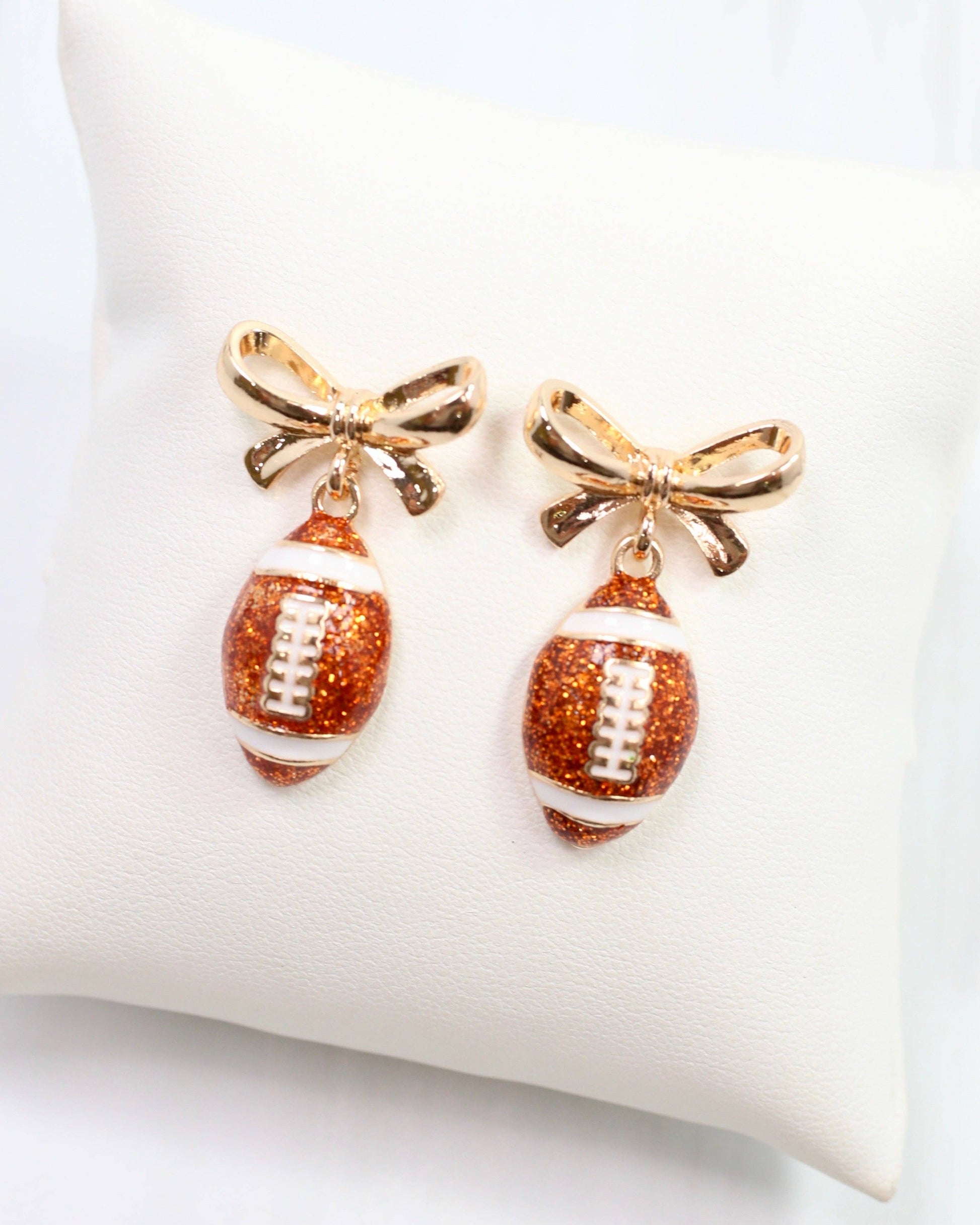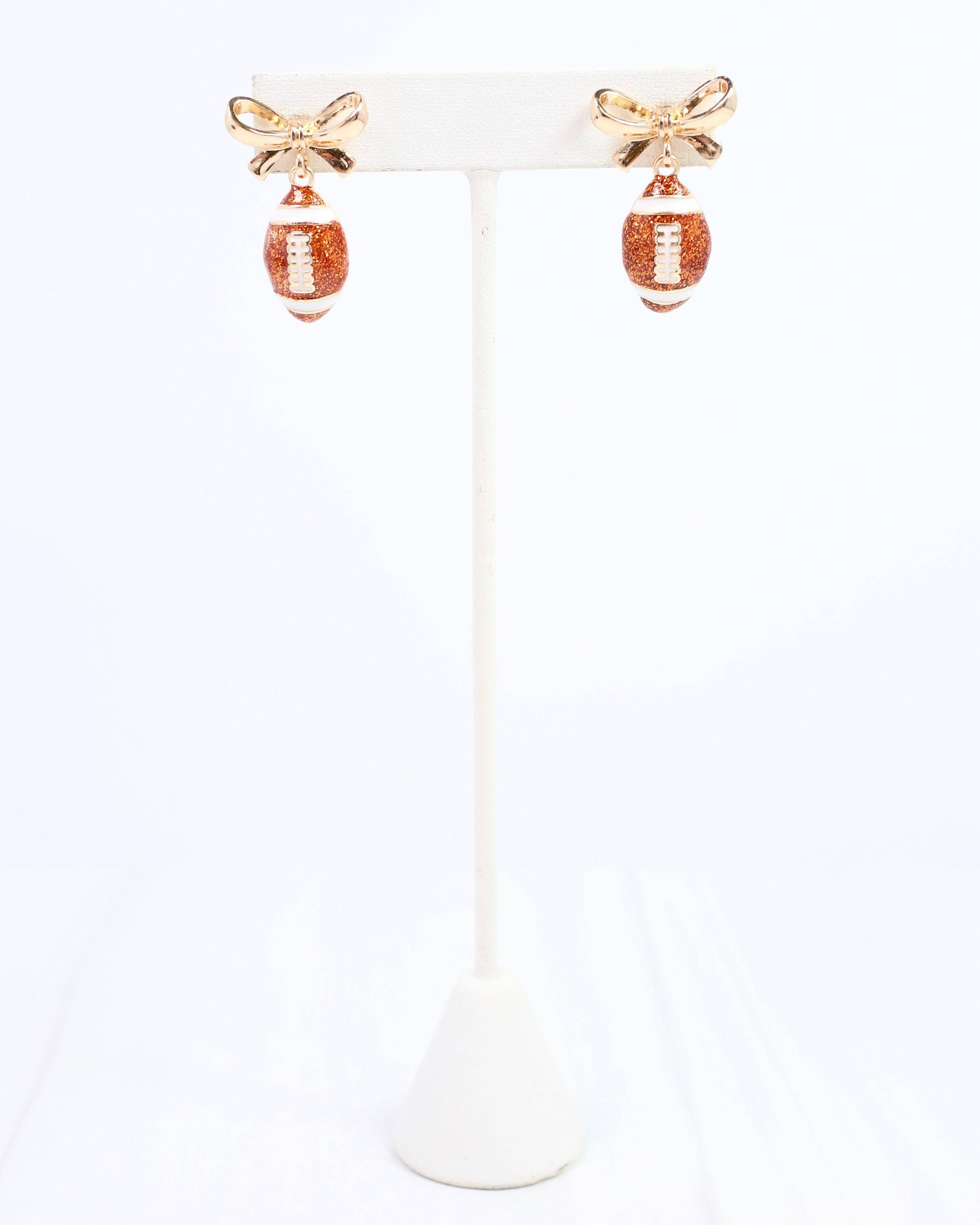 Add a playful touch to your game day look with these Sporty Bow Football Earrings in Gold. Featuring a shiny gold bow on the post and a dangling glitter enamel football, each earring is accented with white enamel on the laces and trim. Perfect for showing off your team spirit with a fun, feminine twist.